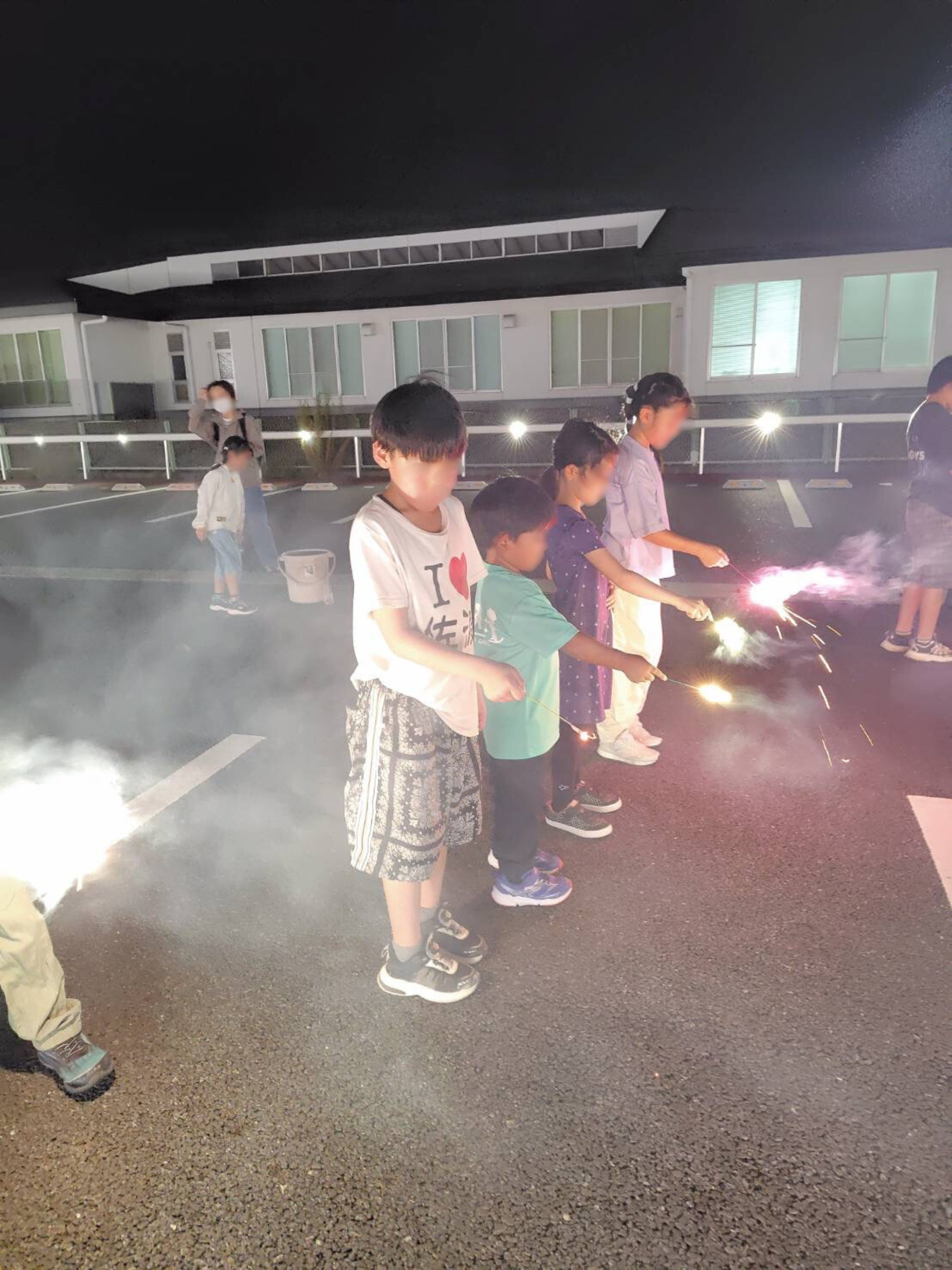 子どもたちは目をキラキラさせながら、手持ち花火を楽しみ、保護者の方々も一緒になって笑顔のひとときに。