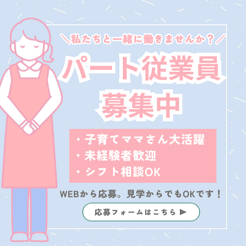 時給 | 1,100円〜 ・毎年昇給あり ・パート従業員の有給休暇消化率100% ・昼食の補助(200円程度でお弁当の提供) |