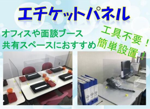 泰生工業が開発した『エチケットパネル』は、ウイルス感染予防として対面時に気になる飛沫物を物理的にガードする自立式飛沫感染防止パネルです。